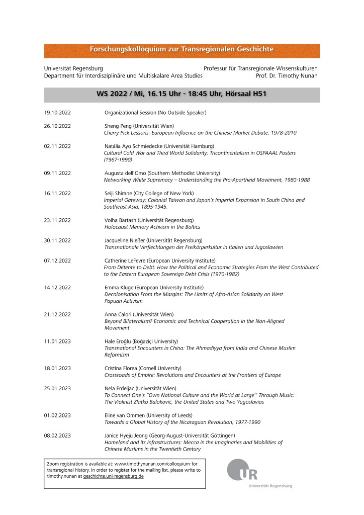 This research colloquium offers students and researchers at the University of Regensburg an opportunity to meet fellow historians and discuss cutting-edge research at the intersection of history and area studies. Each semester, international scholars at varying stages of their career are invited to present their works in progress at the colloquium. Following a presentation from the week’s guest, professors and students have the opportunity to pose questions to that week’s presenter. The research colloquium is open to students, researchers, and the larger public.